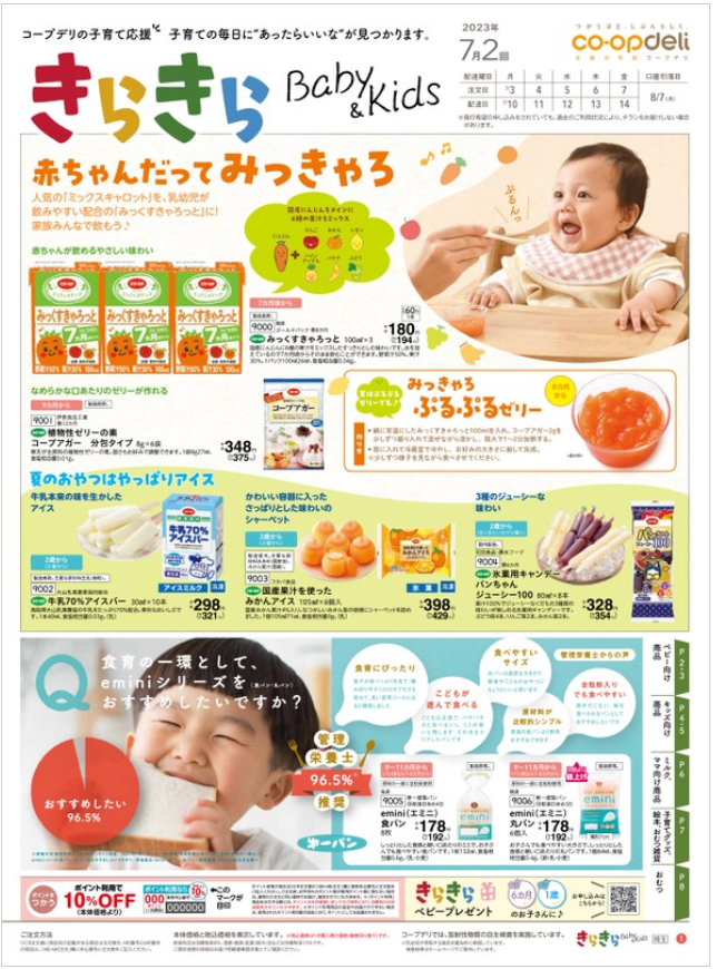 ベビーやキッズ向けの食材や、おむつや歯ブラシといった日用品が揃います。掲載商品をつかった月齢ごとの離乳食のレシピも載っているので、忙しい家族も助かります。
