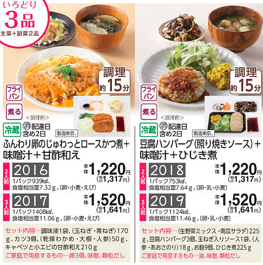 | 冷凍手作りおかず | 17品目 | 380円〜498円 | − | 2人前〜4人前 | 3分〜20分 |