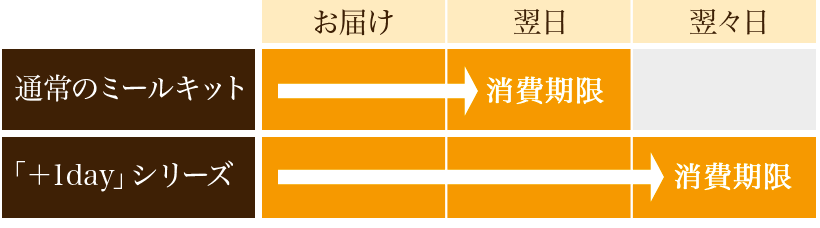 「+1Day」は、通常のミールキットより消費期限が長い商品です。期限は配達日を含めて3日間です。
