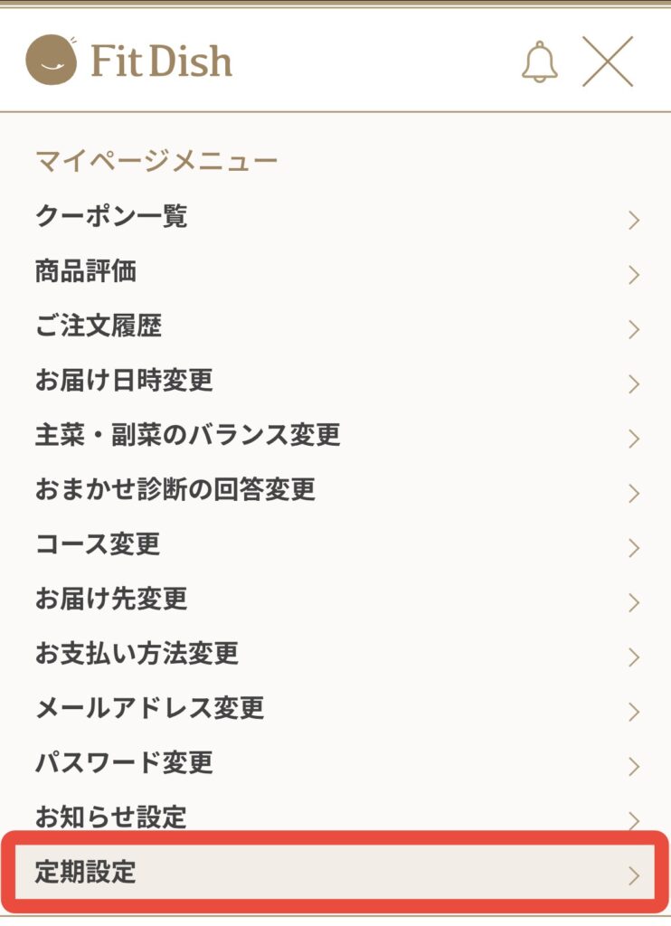 フィットディッシュのマイページメニューから「定期設定」をタップしてください。