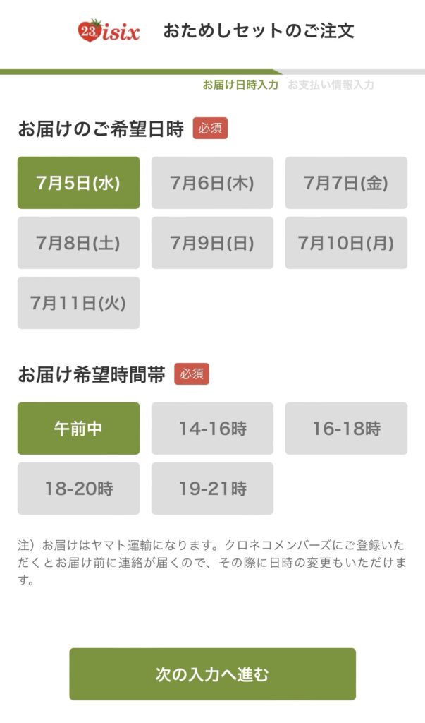 オイシックスの食材はヤマト運輸(クール便)でのお届けになります。おためしセット申込時に日にちや時間の指定ができますよ。