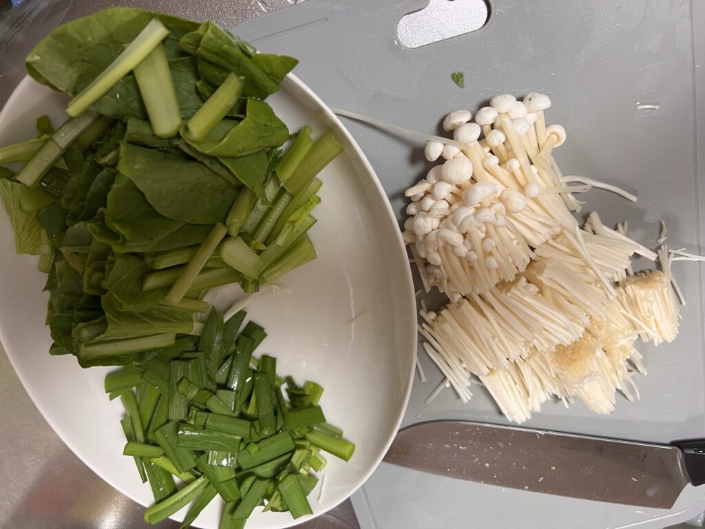 にんじんは元からカットされていますが、葉物やきのこ、豆腐などはそのままの状態で届きます。調味料やトッピングもセットに入っているので、用意するものは基本調味料と中華だしだけ。