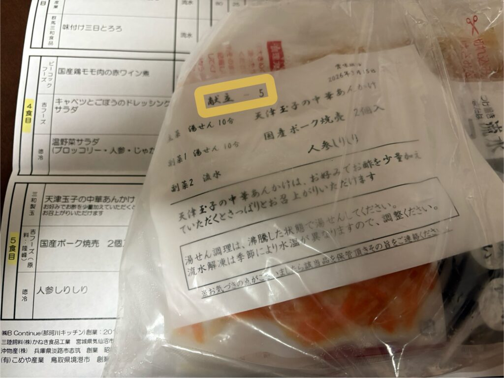 | 品数 | 主菜1品、副菜2品×5食 | 主菜1品、副菜2品×10食 |
