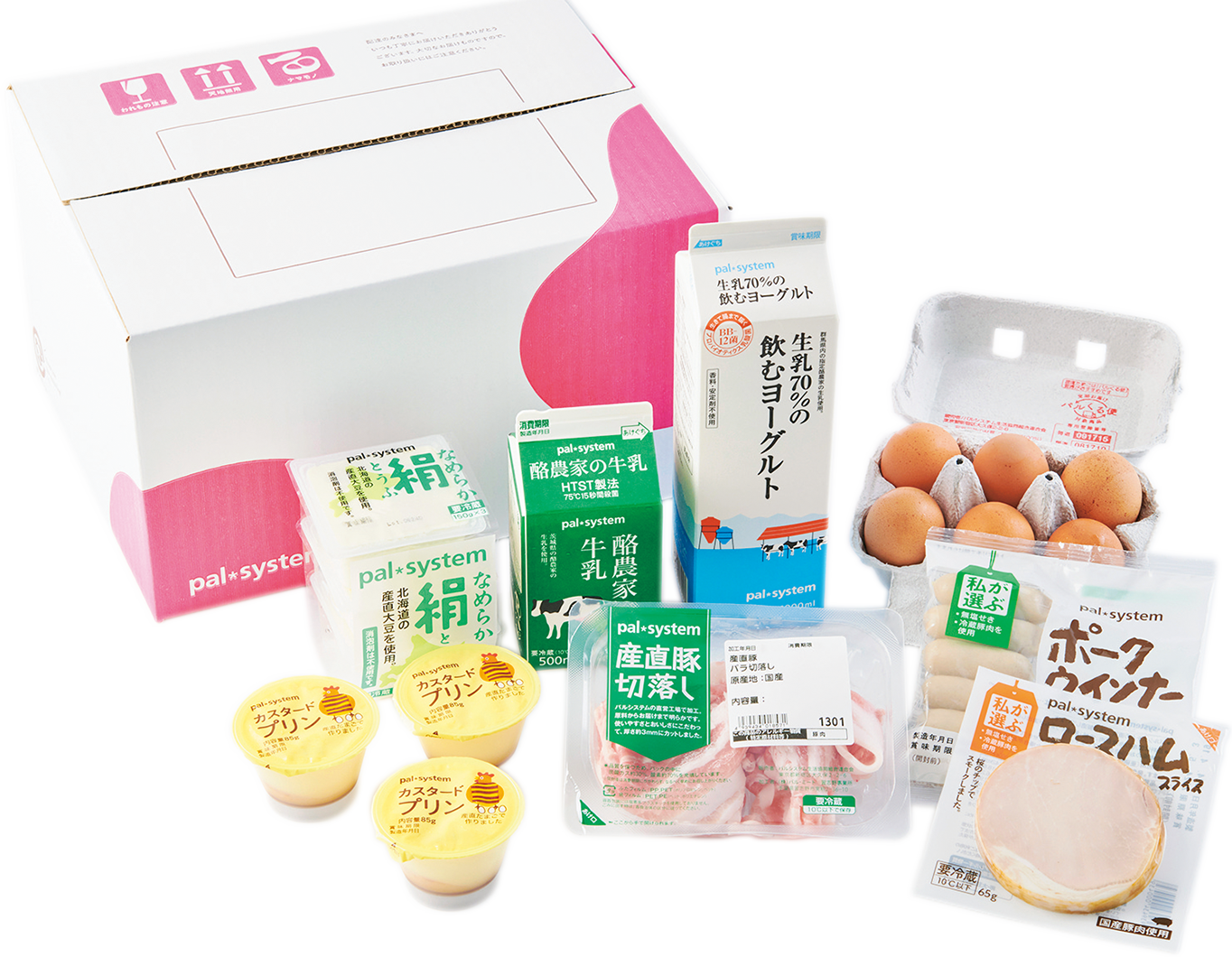 | 内容 | ①産直豚バラ切り落とし ②産直たまご ③ロースハムスライス ④ポークウインナー ⑤飲むヨーグルト ⑥なめらか絹とうふ ⑦酪農家の牛乳 ⑧カスタードプリン | ①さわら竜田揚げ ②までっこ鶏モモ肉 ③九州のほうれん草 ④北海道冷凍栗かぼちゃ ⑤茎が長めのブロッコリー ⑥ミニ厚揚げ | ①さばの味噌煮 ②銀だら西京漬 ③秋鮭スモークサーモン ④かれい煮付 ⑤まぐろの漬けカツ | ①うらごしコーン ②バランスキューブ(黄・緑) ③やわらかうどん ④直火炒めチャーハン ⑤餃子にしよう! ⑥さばのみぞれ煮(骨とり) | ①北海道産直牛小間切徳用 ②日本のこめ豚カタ・モモ切落し ③産直豚カタロース切落し ④産直豚バラ切落し徳用 ⑤ボンレスハムスライス ⑥あらびきポークウインナー |