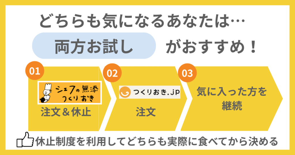 「つくりおき.jp」「シェフの無添つくりおき」それぞれの比較からおすすめできる人をまとめます。