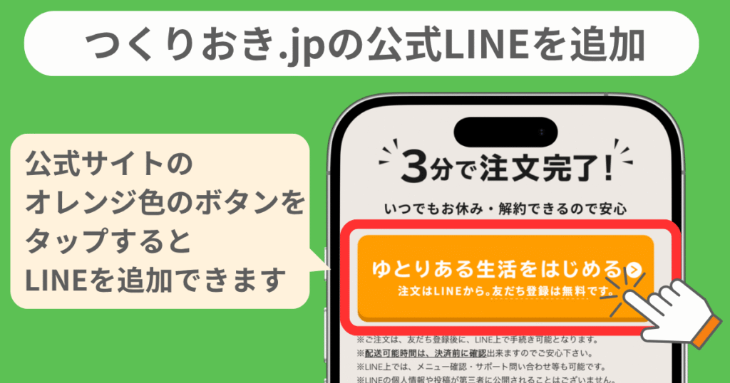 まずは公式サイトの「ゆとりある生活をはじめる」をタップして、つくりおき.jpの公式LINEを友だち追加してください。